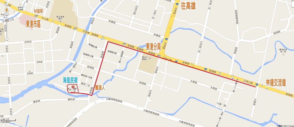 高雄「小港交流道」下→台17線 --- 林園--- 新園烏龍 →過東港大橋直行→東港分局路口右轉→後下一個紅綠燈→左轉船頭路再直行→過下一個號誌燈→留意釀酒人對面→嘉新一街右轉→直行100公尺抵達
